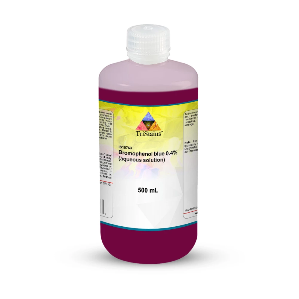 A 0.4% solution of bromophenol blue refers to a solution where the concentration of bromophenol blue in water is 0.4%. Bromophenol blue is a synthetic dye with the molecular formula C19H10Br4O5S. It belongs to the triphenylmethane dye family. In its solid form, it appears as dark purple crystals. When dissolved in water, it yields a blue solution. Its color changes depending on the pH of the solution. It turns yellow in acidic conditions and blue in alkaline conditions. 0.4% solution of bromophenol blue offers increased sensitivity compared to lower concentrations, making it valuable for pH determination, electrophoresis techniques, staining, and other laboratory applications.