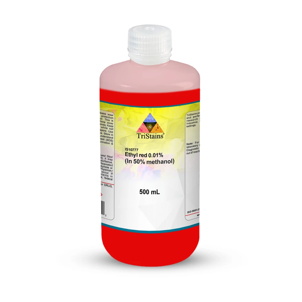 Ethyl Red is a dark red to dark purple powder. Its chemical formula is C17H19N3O2. Ethyl Red is an azo dye that is commonly used as a pH indicator due to its pH-sensitive color change properties. Ethyl Red 0.01% in 50% methanol is a solution consisting of the chemical compound Ethyl Red dissolved in a solvent mixture of 50% methanol and 50% water. The solution typically appears as a reddish-orange liquid. Ethyl Red is more soluble in organic solvents like methanol compared to water, hence its preparation in a methanol-water mixture. In acidic conditions, it appears yellow, while in basic conditions, it turns red. Ethyl Red 0.01% in 50% methanol is a valuable pH indicator used in analytical chemistry and biochemical assays.