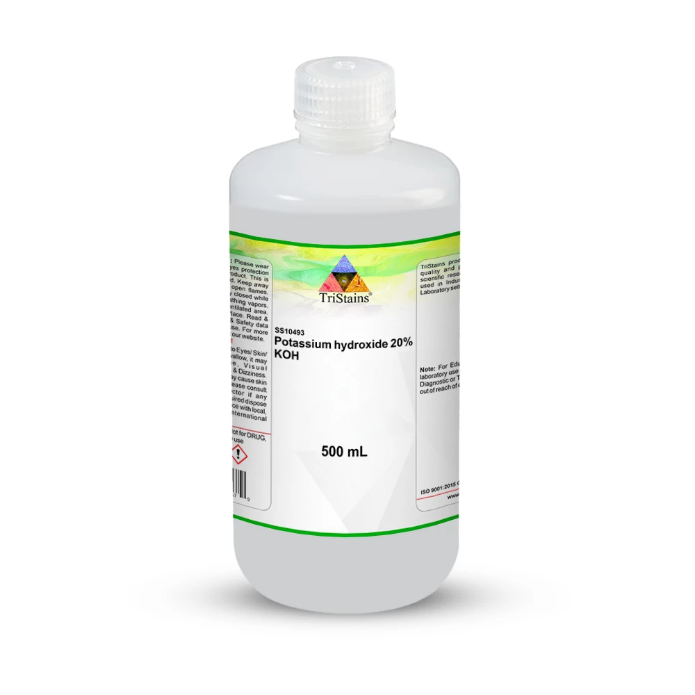 KOH, or potassium hydroxide, is an inorganic compound with the chemical formula KOH. It is commonly referred to as lye or caustic potash. The 20% KOH stain solution is a transparent and colorless liquid. This solution is highly alkaline and contains 20% potassium hydroxide. It is utilized as a staining agent in various applications. In the field of histology and cytology, the 20% Potassium Hydroxide stain solution is extensively employed to facilitate the staining and preparation of biological samples for thorough microscopic examination and analysis.